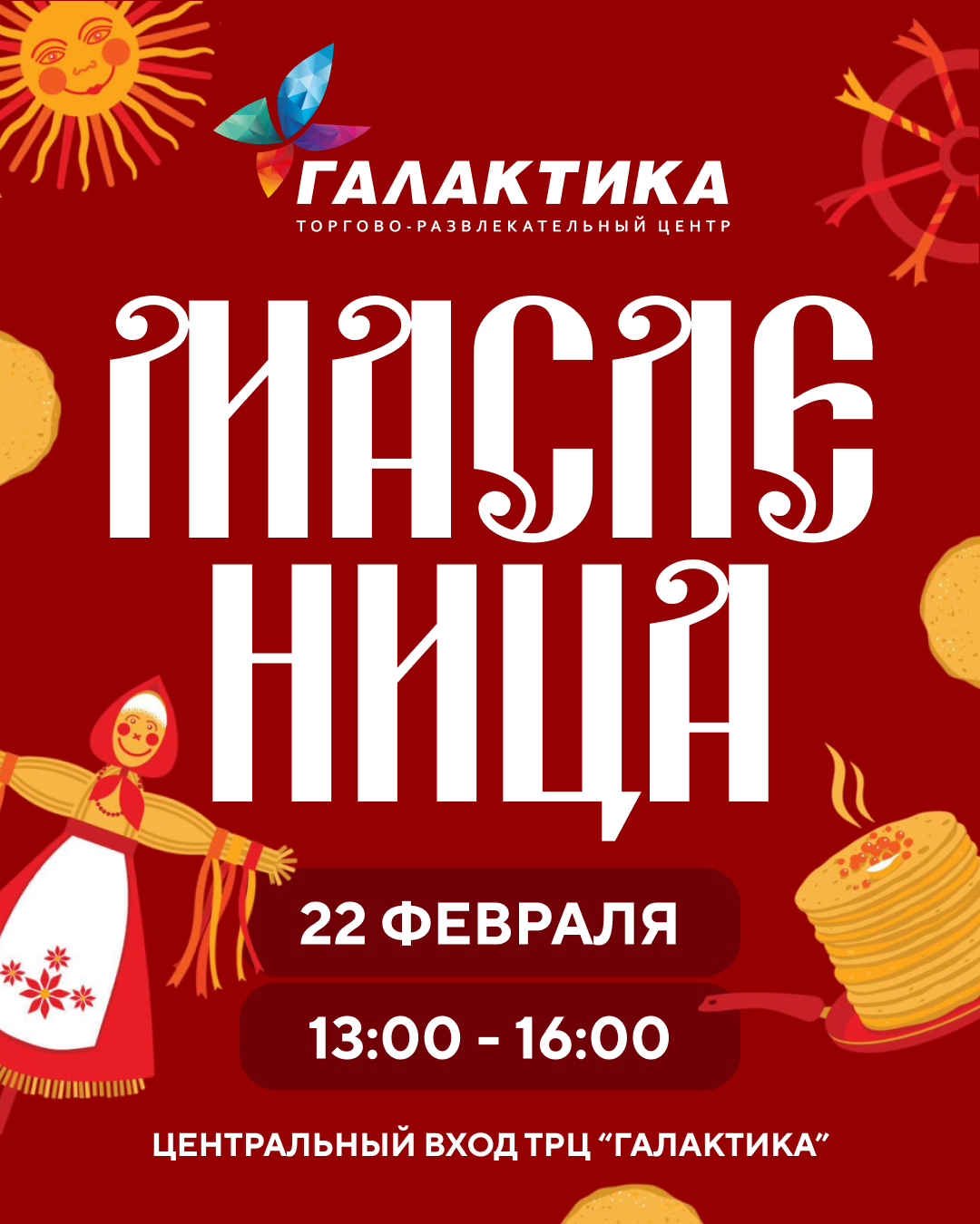 Приглашаем вас окунуться в атмосферу настоящего народного гулянья на празднике «Широкая Масленица»! Событие пройдёт в торгово развлекательном центре «Галактика» 22 февраля с 13:00 до 16:00. Вас ждёт яркая программа, полная веселья, творчества и вкусных сюрпризов: • Зажигательные выступления русского народного коллектива «Славяне» — погрузитесь в мир народной музыки и танца! • Весёлые конкурсы от ведущего: поднимите гирю, перетяните канат, посоревнуйтесь в «Блинной эстафете» и других забавах. Призы ждут самых смелых и ловких! • Творческие мастер классы — создайте своими руками масленичную куклу оберег, распишите деревянную ложку или украсьте пряник. Всё необходимое предоставим! • Угощение блинами и горячим чаем — отведайте ароматные блины с разнообразными начинками и согрейтесь душистым чаем из самовара. • Огненное шоу у центрального входа — завораживающее зрелище в финале праздника!